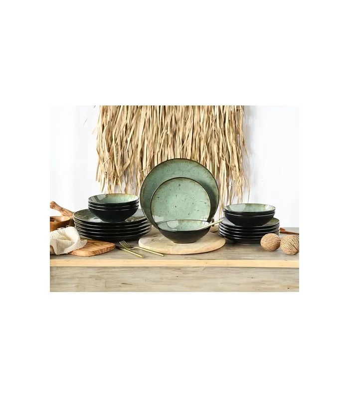 Elegant plate set: 18 design pieces are waiting to decorate your table. The 18-piece tableware includes 6 27 cm dinner plates, 6 dessert plates 21 cm and 6 soup plates/bowls of 18 cm for soups, salad, pasta or cereals. Exotic flair: this tableware is reminiscent of the tropical island of Java. In doing so, the intense green color reflects the lush greenery of the jungle landscape. Reactive glaze: the Jawa series impresses with its intense green reactive colour, which gives each piece a unique look and makes your dining table an eye-catcher. Sustainable joy: the tableware accompanies you all day long. It is extremely durable and of course also dishwasher and microwave safe. Brand quality: Our tableware is designed in Germany and produced in selected premium factories to provide you with the quality you want for your home. In addition, breakage replacement is usually provided in a timely manner and for years