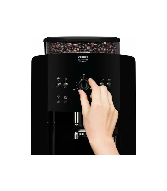 - This fully automatic Krups Arabica espresso machine EA8110 with simple control panel with rotary knobs