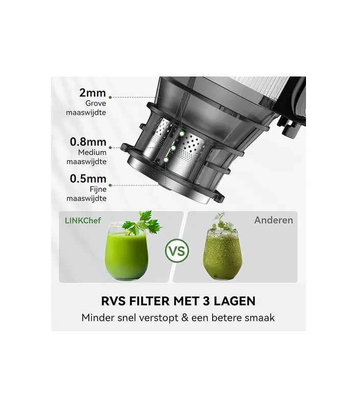 - Free hands: Slow juicer with a 1.8-liter chamber. This allows you to process large quantities effortlessly, without adding the ingredients one by one. Ideal for weekly preparation or entire families – simply fill, juice and repeat.