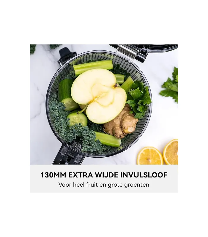 - Suitable for whole fruits: Our fully improved juicer with a 130 mm feed slide is three times larger than normal juicers. You can now place whole apples inside, without reducing them first. This saves you time and makes juicing effortless.