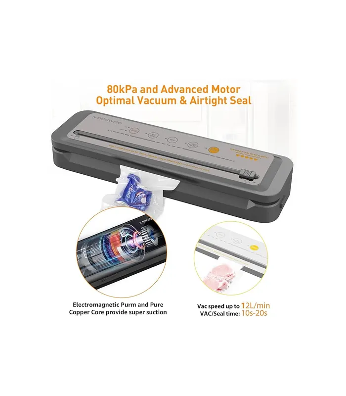 - Mega Power & Energy-Saving Seal – Achieve perfect vacuum seal in just 10-20 seconds with 80 kPa powerful suction and premium heating wire. The MegaWise vacuum sealer retains the freshness of food up to 5x longer, prevents freezer burning and reduces waste. Keep your food fresh, flavorful and ready to enjoy!