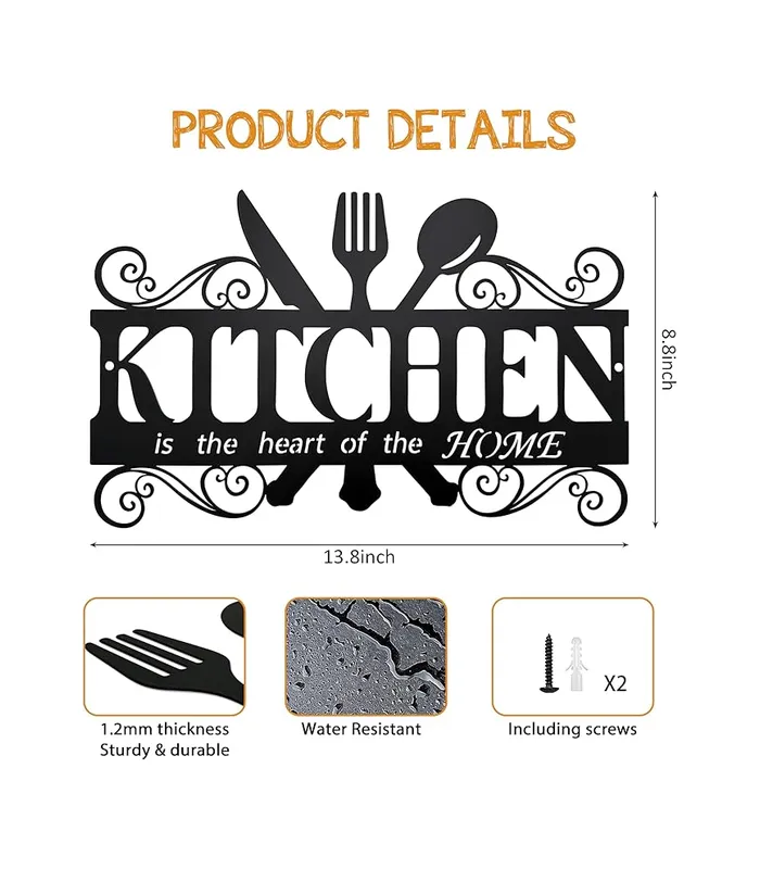 - 【KITCHEN WALL DECOR】 Kitchen wall sign adds a beautiful and lively touch to your farmhouse kitchen and dining room. Add an elegant touch to your kitchen decor with this metal kitchen sign. This kitchen decor is suitable for hanging on your kitchen wall. As described in the text above: “The kitchen is the heart of the home”.