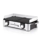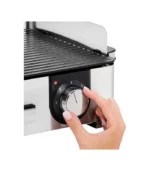 - The non-stick grill plates (surface 28 x 50 cm) with integrated heating elements are operated via rotary knobs (variable temperature setting) and ensure even heat distribution