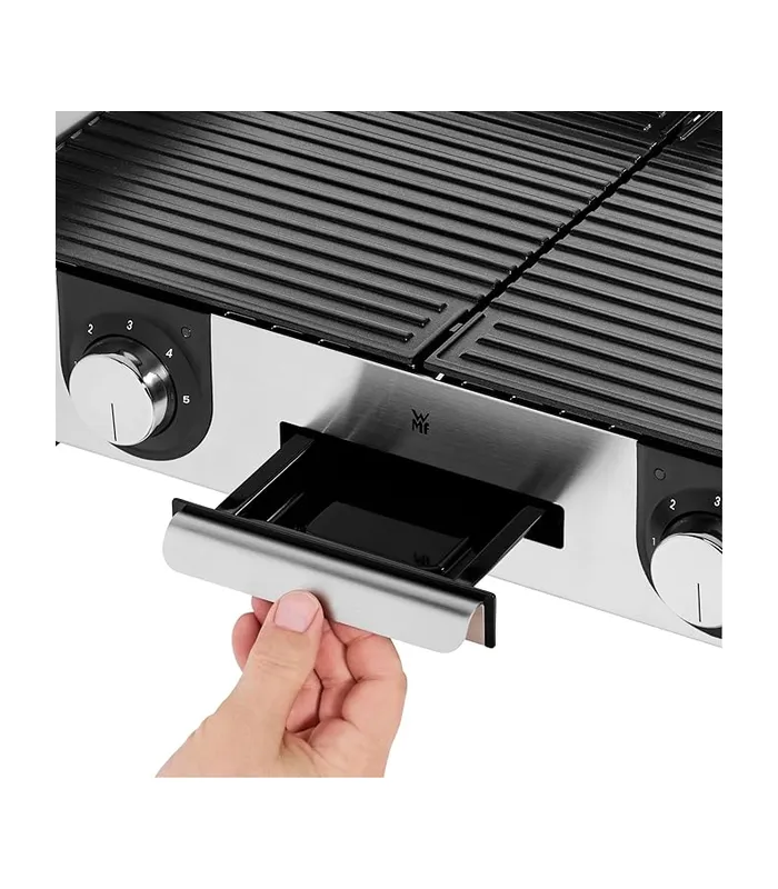 - The separately adjustable grill surfaces allow simultaneous cooking at the appropriate optimum temperature or also keeping warm on one grilling on the other plate